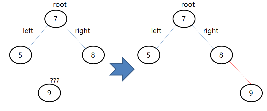 2. Tree에 node를 추가하는 함수를 만든다. 추가하고자 하는 데이터가 기존의 데이터보다 작으면 left subtree로 향하고, 크면 right subtree로 향한다. 언제까지? leaf node가 될 때까지