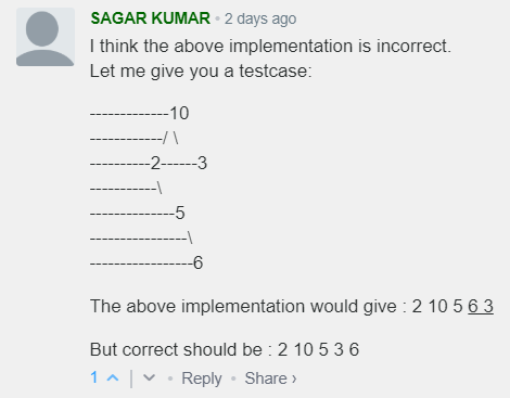 pre-order traversal로 트리를 탐색하고 노드를 배열에 저장하기때문에 left-subtree의 child가 right-subtree아래로 뻗어나가는 경우 출력순서가 뒤바뀌게 되는 문제가 발생한다. (좌측 sub-tree의 값을 배열에 먼저 저장하기 때문)