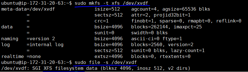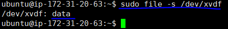 file -s : 파일 시스템의 유형 등 디바이스 정보 확인