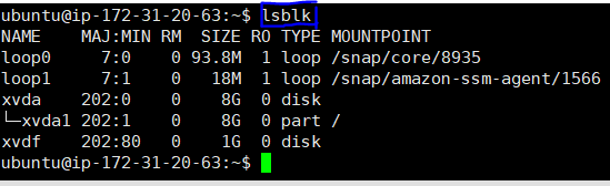 xvda가 초기화할 때 만들어진 root 디바이스 이고, xvdf가 새로 추가로 연결된 EBS이다. xvdf의 mountpoint가 공란인 것을 토대로 이것이 아직 마운트되지 않았음을 알 수 있다.