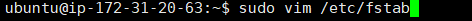 vim을 이용해 fstab파일을 편집환경에서 조회하면 위 이미지의 첫번째 줄만 나온다. 아래 UUID로 시작하는 내용을 추가한다. UUID는 아까 복사해둔 xvdf의 UUID를 넣는다.