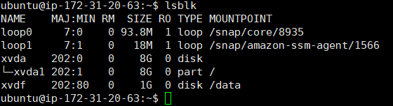 lsblk 명령어를 사용해 디바이스 정보를 확인하면 xvdf가 /data 경로에 mount된 것을 확인할 수 있다.