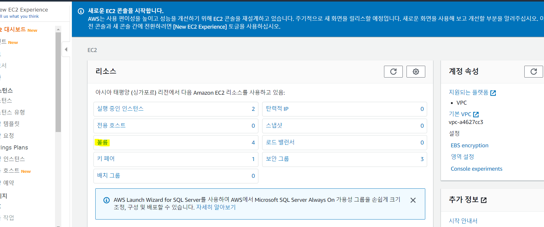 EC2 인스턴스를 초기화하고 대시보드 섹션에서 볼륨에 들어간 뒤