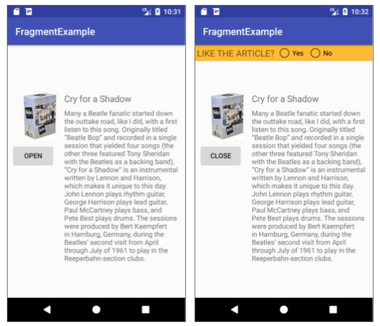 위에서 Fragment 사용시 얻을 수 있는 이점 중에 Activity UI에 결합되어서 유저와 상호작용을 할 수 있다는 부분이 있었다. 이 예시에서 그것을 확인할 수 있다. OPEN 버튼 클릭시 상단에 선호도여부를 묻는 노란색 띠의 UI가 추가되고 유저로부터 input을 받을 수 있다.