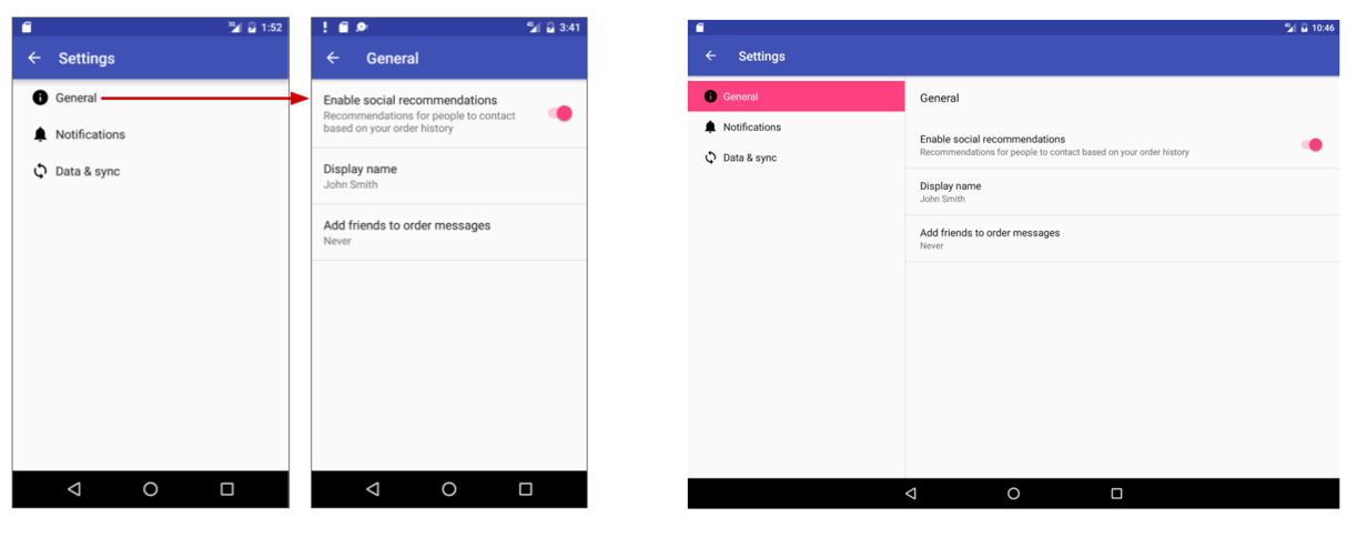 왼쪽의 사진의 환경설정처럼 카테고리별로 세부사항을 조회하는 경우가 있다고 하자. 이때 fragment에서는 왼쪽 첫번째화면의 Settings 가 master이고 General 부분이 detail로 구분이 된다. 따라서 아이패드같이 큰 디스플레이에서 조회될 때 단순히 화면이 크게 보이는 것이 아니라, master부분은 왼쪽에 detail부분은 오른쪽에 배치된다. 패드 뿐만 아니라 갤럭시 폴드 등 화면 크기가 다양한 환경에서 안드로이드 앱이 사용된다. 이러한 현실상황을 고려했을 때 fragment를 잘 활용하는 것이 바람직하다고 여겨진다.