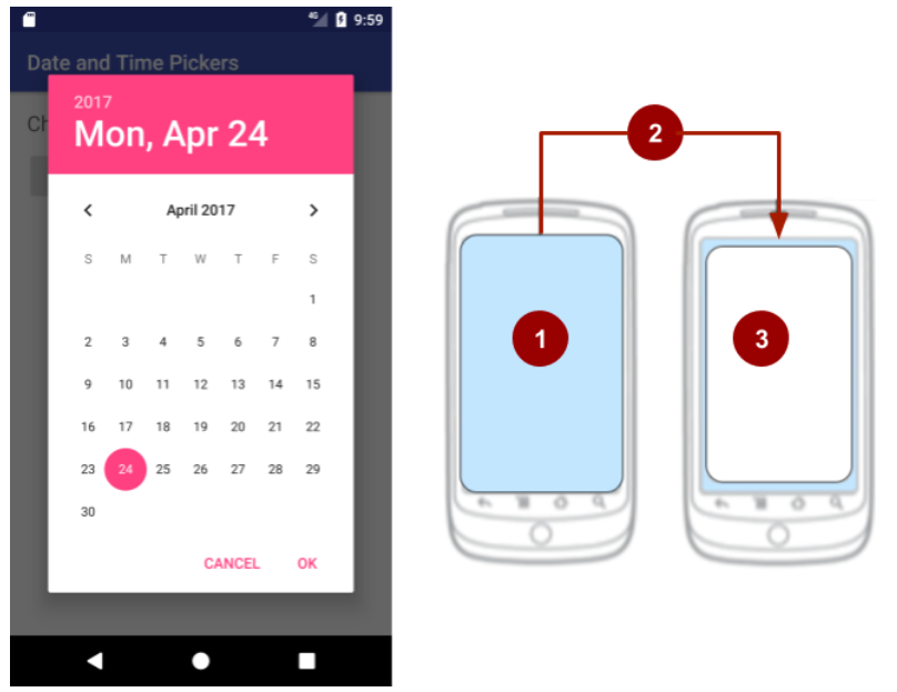 왼쪽의 그림과 같이 어떤 엑티비티(1) 위에 버튼이 있고 그 버튼을 눌렀을 때(2) 캘린더 프레그먼트가 화면에 활성화(3)된다고 하자. 해당 예시에서는 DialogFragment를 사용했다.