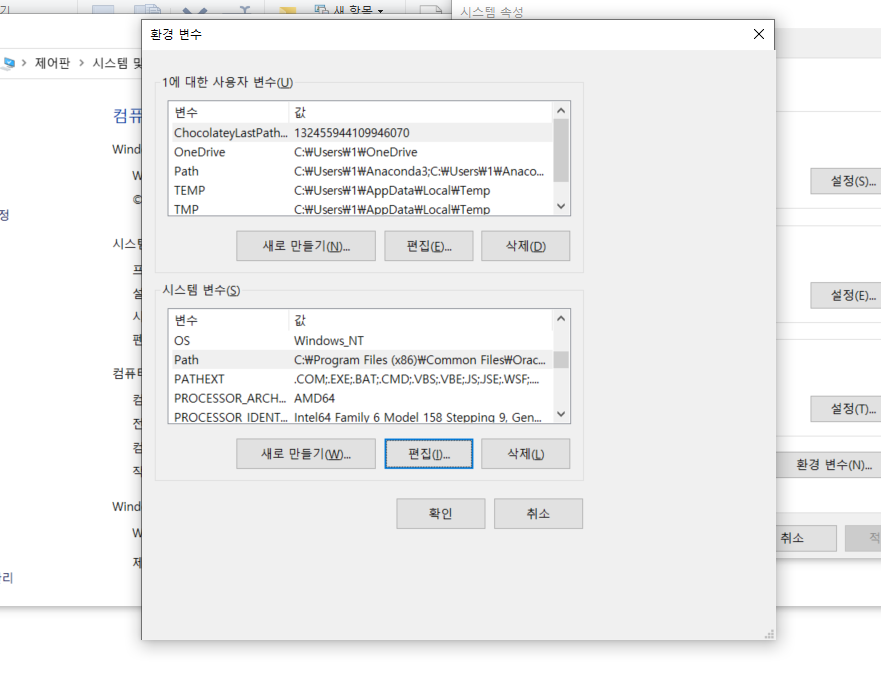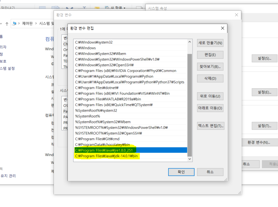 제어판=> 시스템 및 보안 => 시스템 => 설정변경 => 고급 => 환경변수