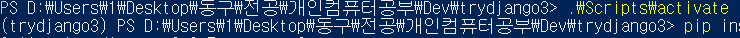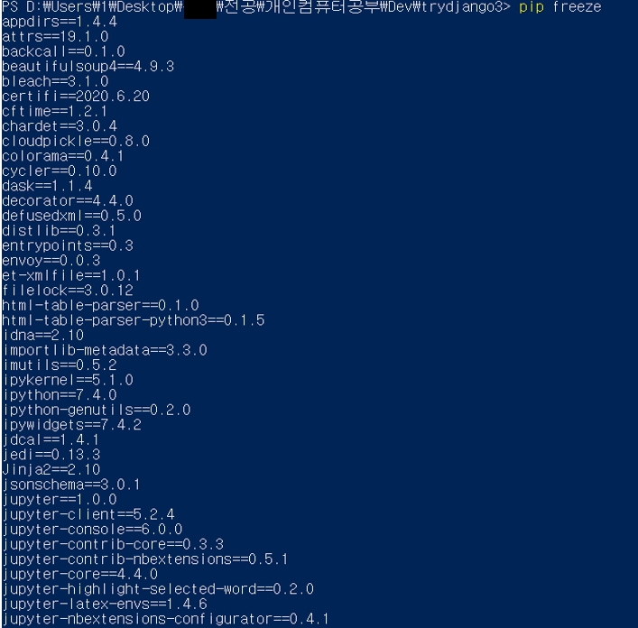 pip freeze를 새로 만든 가상 개발환경에서 실행시켜보면
