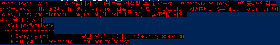 PowerShell 에서 가상 개발환경을 세팅하려다 아래와 같은 activation error가 발생했다.