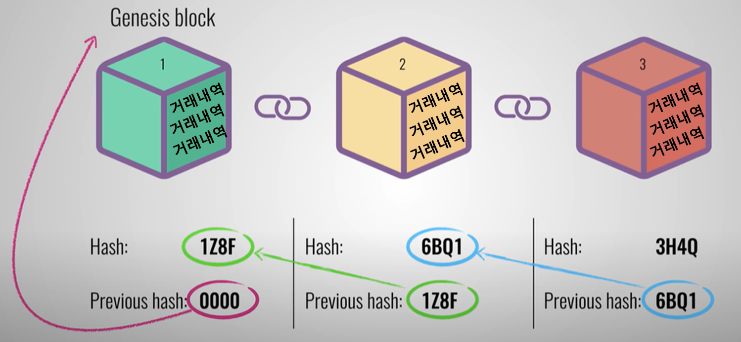 정보가 기록된 블록들은 이전 블록의 해시값을 가지는 방식으로 서로 묶여있습니다.