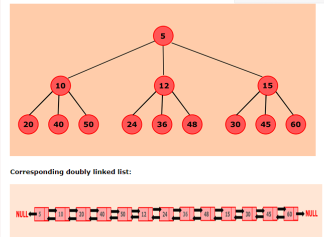 예를 들어 위와 같은 트리가 주어졌다고 가정하면, 트리 아래에 있는 doubly list의 형식으로 저장됩니다.