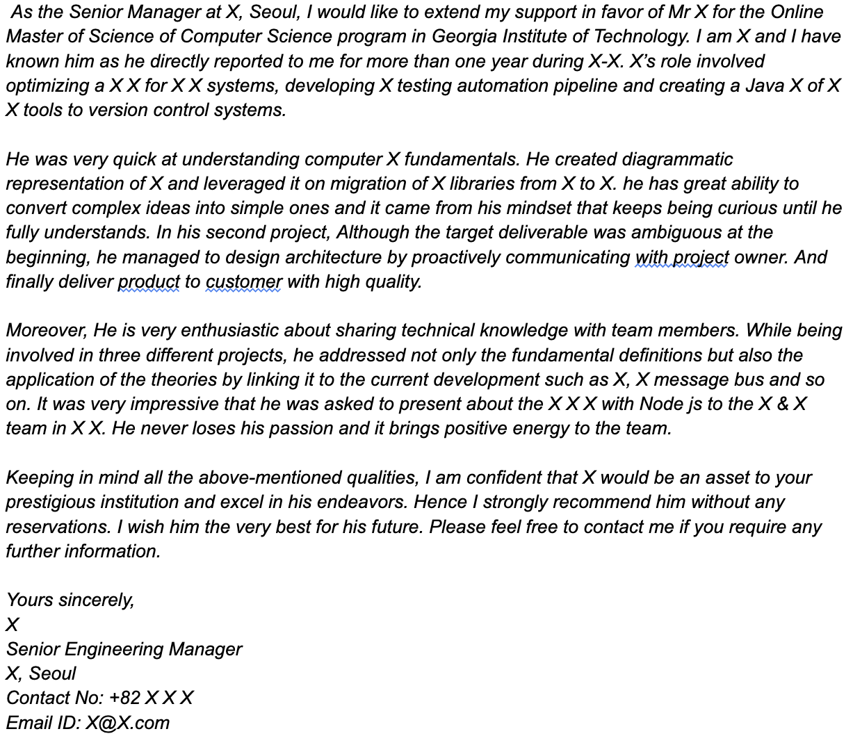 회사에서 직접 매니저님과 팀리드분께 찾아가 초콜릿을 드리며 지원 동기와 추천서 요청에 이르기까지의 상황을 설명드렸습니다. 직장 상사분들은 제가 미리 샘플 추천서를 작성하고 이를 본인이 추가/수정해서 작성하는 방식을 제안하셨습니다. 따라서 저는 2개의 프로페셔널 추천서를 준비해서 공유드렸습니다.