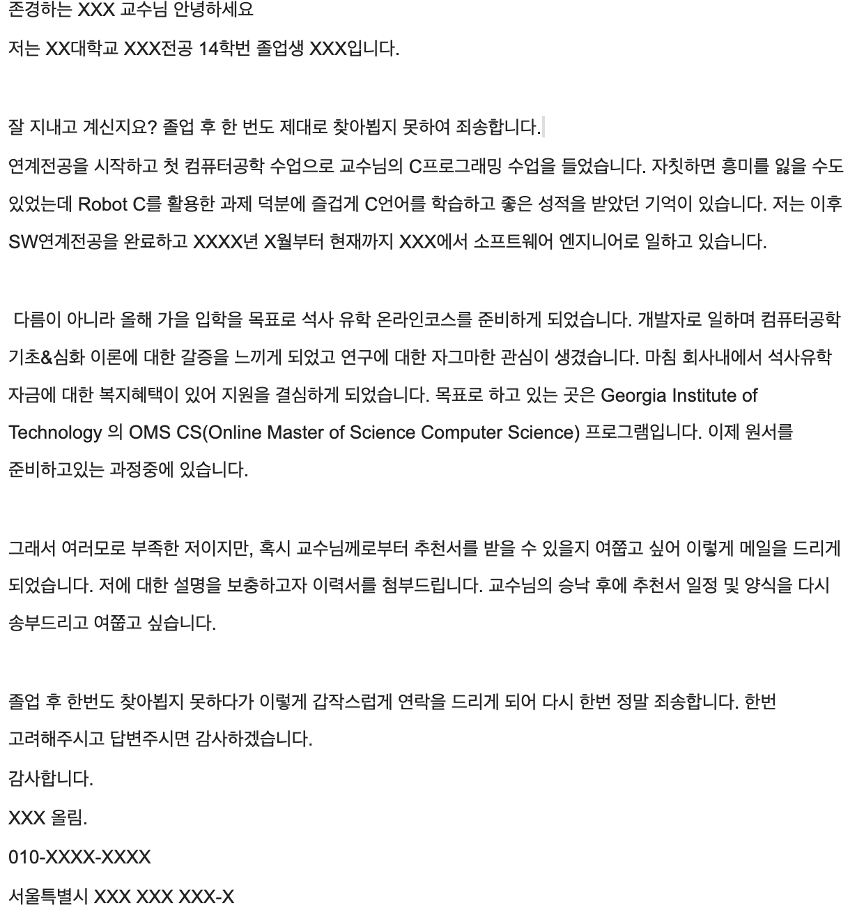 따라서 이에 대한 감사함을 잘 표현하는 것과 최대한 편하게 추천서를 작성하실 수 있게 도와드리는 것이 중요하다고 생각이 들었습니다.