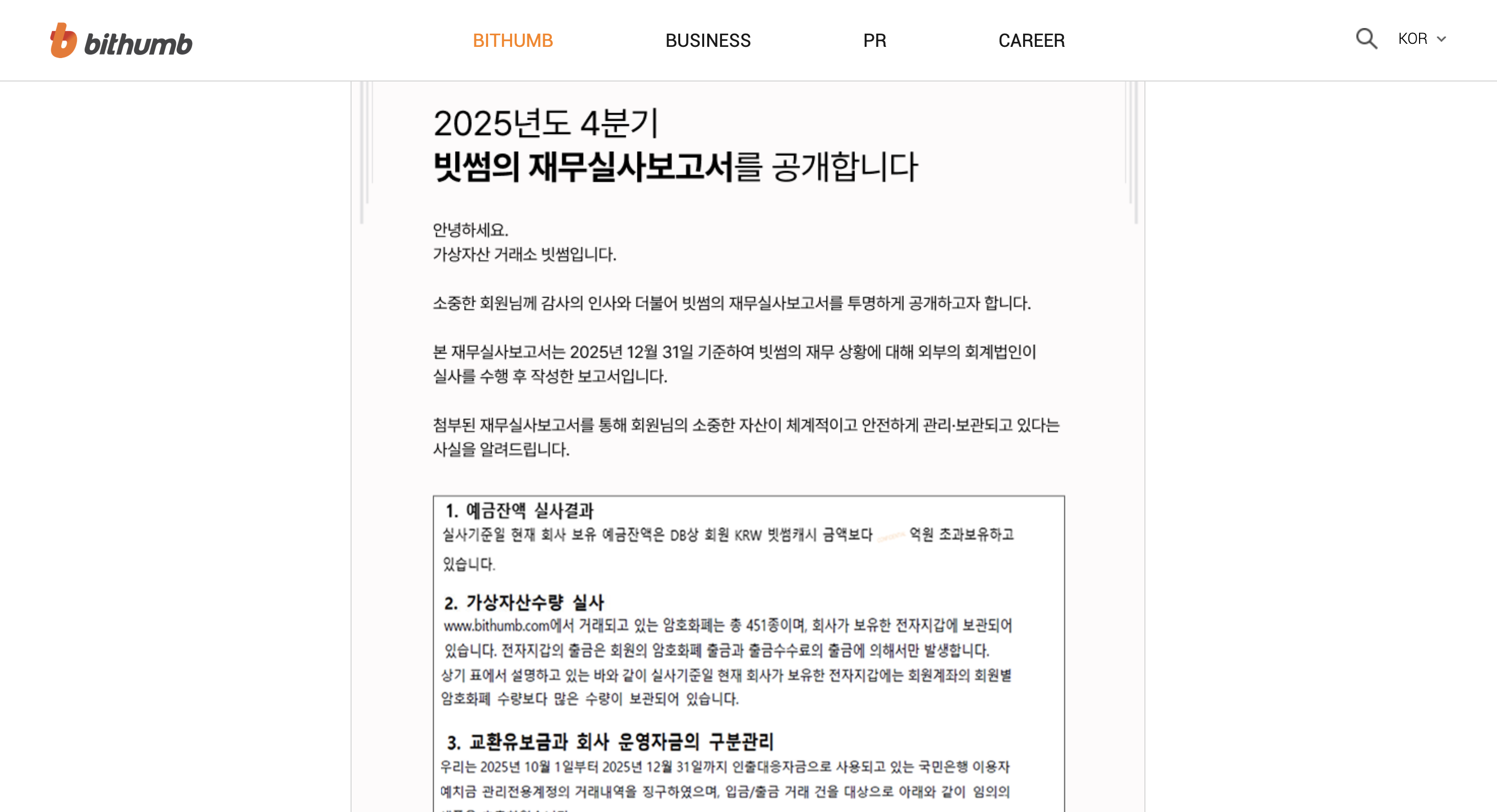 한국의 4대 거래소는 분기별로 회계법인과 함께 가상자산 실사 보고서를 발표한다. 다만 정보가 제한적이고 그 사이에 어떤 일이 발생하면 이를 막거나 탐지할 수 없다는 단점이 있다.