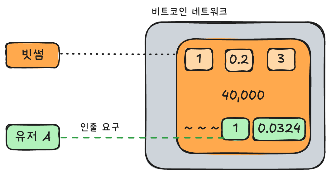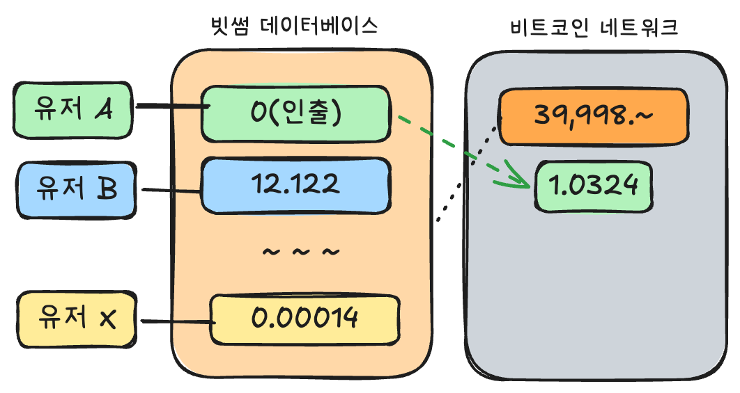 따라서 유저가 실제 비트코인 인출을 요구하면 아래와 같이 비트코인 네트워크에서 빗썸 소유분 비트코인 중 일부의 명의를 유저의 명의로 바꾼다.