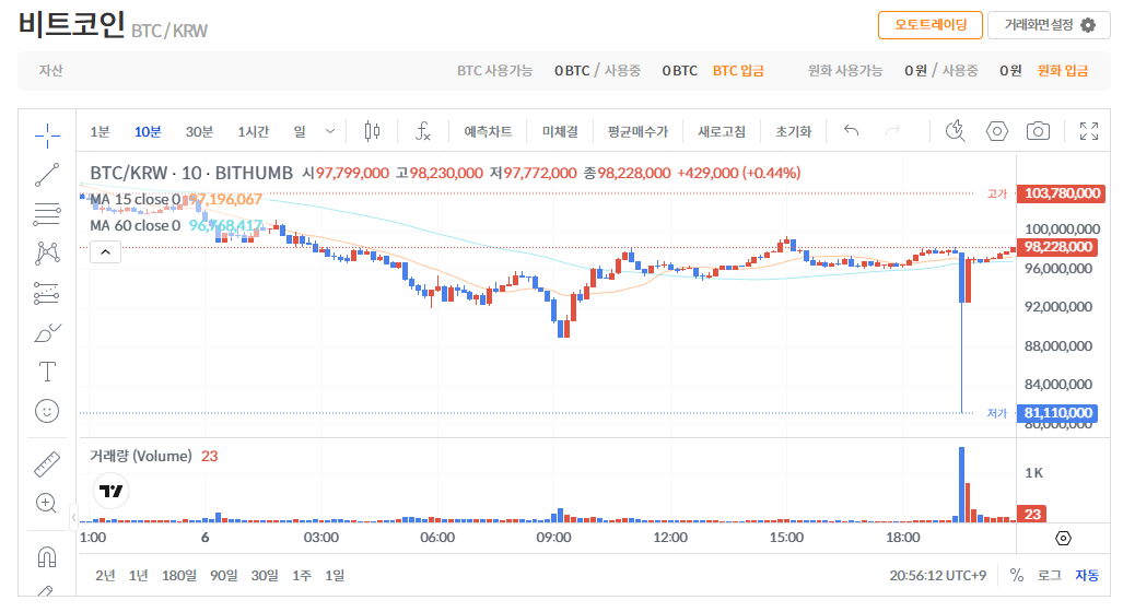 유저의 비트코인 인출 이후에 빗썸 화면에서는 유저 A의 잔고가 0으로 업데이트된다.