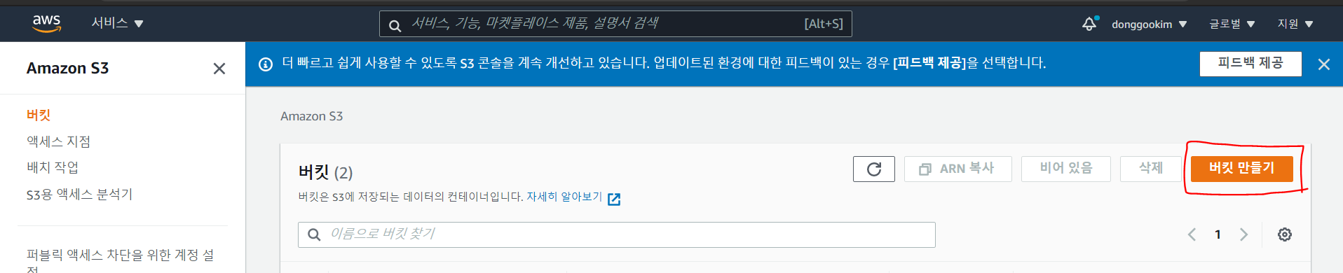 일단 이미지 파일을 저장할 S3 버킷을 만듭니다.
