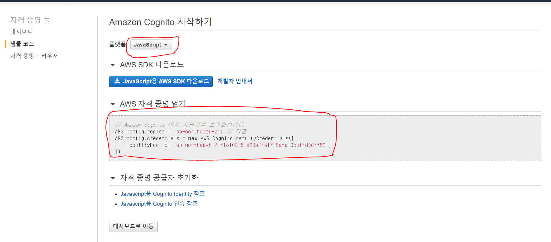 플랫폼을 JavaScript로 변경하고 AWS 자격증명 얻기 부분을 복사해놓습니다.