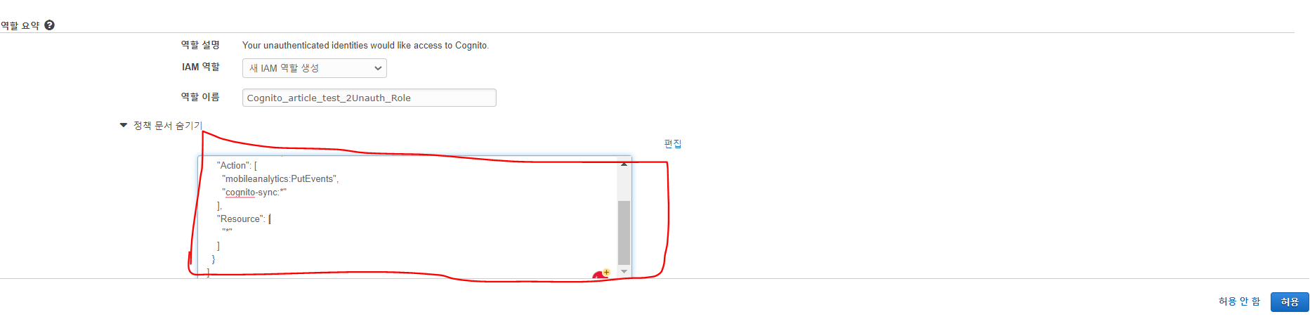 unauthenticated 역할 부분의 정책문서 보기를 누른후 아래의 정책 부분을