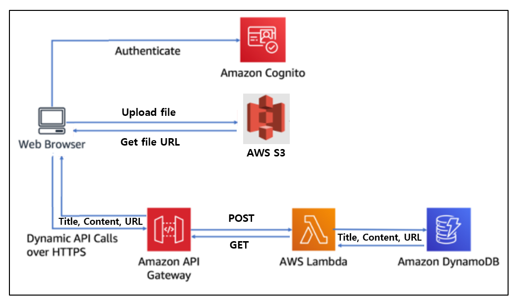 AWS 제품을 활용해 서버리스 웹 어플리케이션을 구현하기 시작한 사람들을 위해 글을 게시합니다. 구조는 아래와 같습니다. 구조를 간단하게 설명하면 1. DynamoDB에 특정 작업을 하는 Lambda함수를